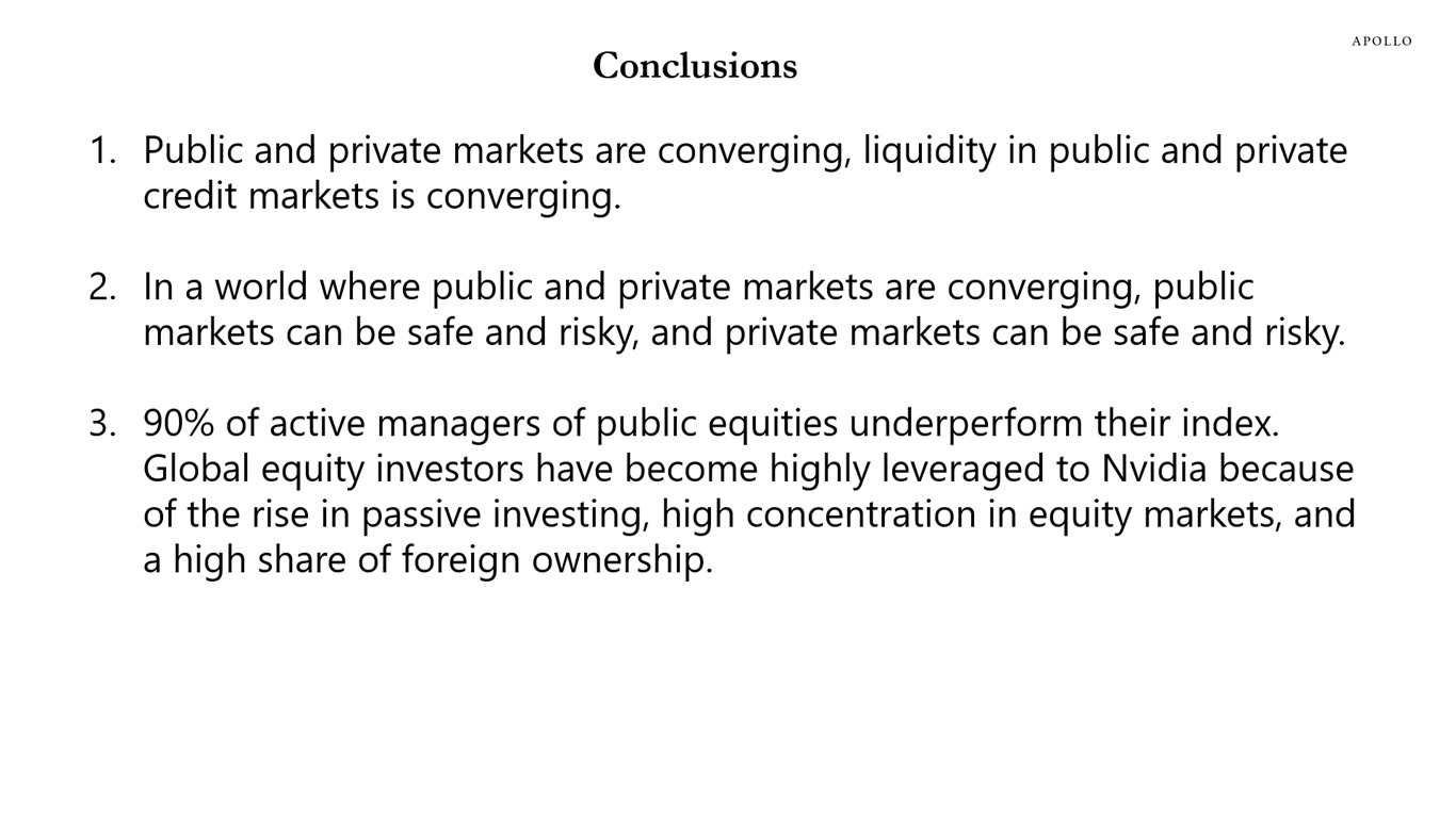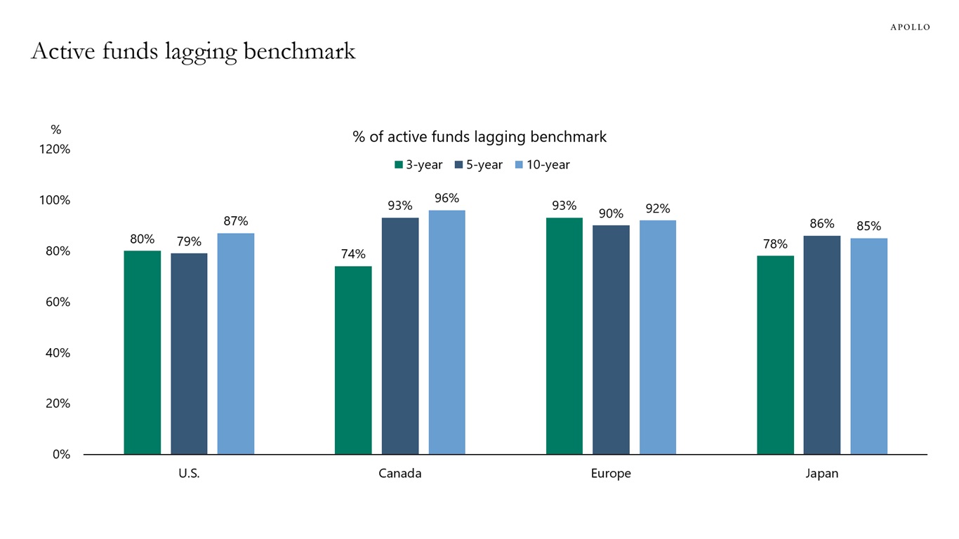 3) Roughly 90% of active managers of public equity and public fixed income underperform their benchmark indexes.