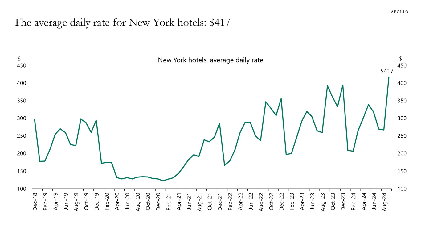 The average daily rate for a hotel in New York is at a record-high of $417, see chart below.