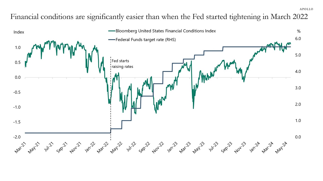 Financial conditions are significantly easier than when the Fed started raising interest rates in March 2022, see chart below.