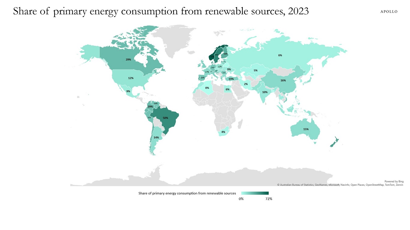 The map below shows the share of primary energy consumption coming from renewable sources across countries, and the bottom line is that there is a significant need for investment in renewable energy around the world.