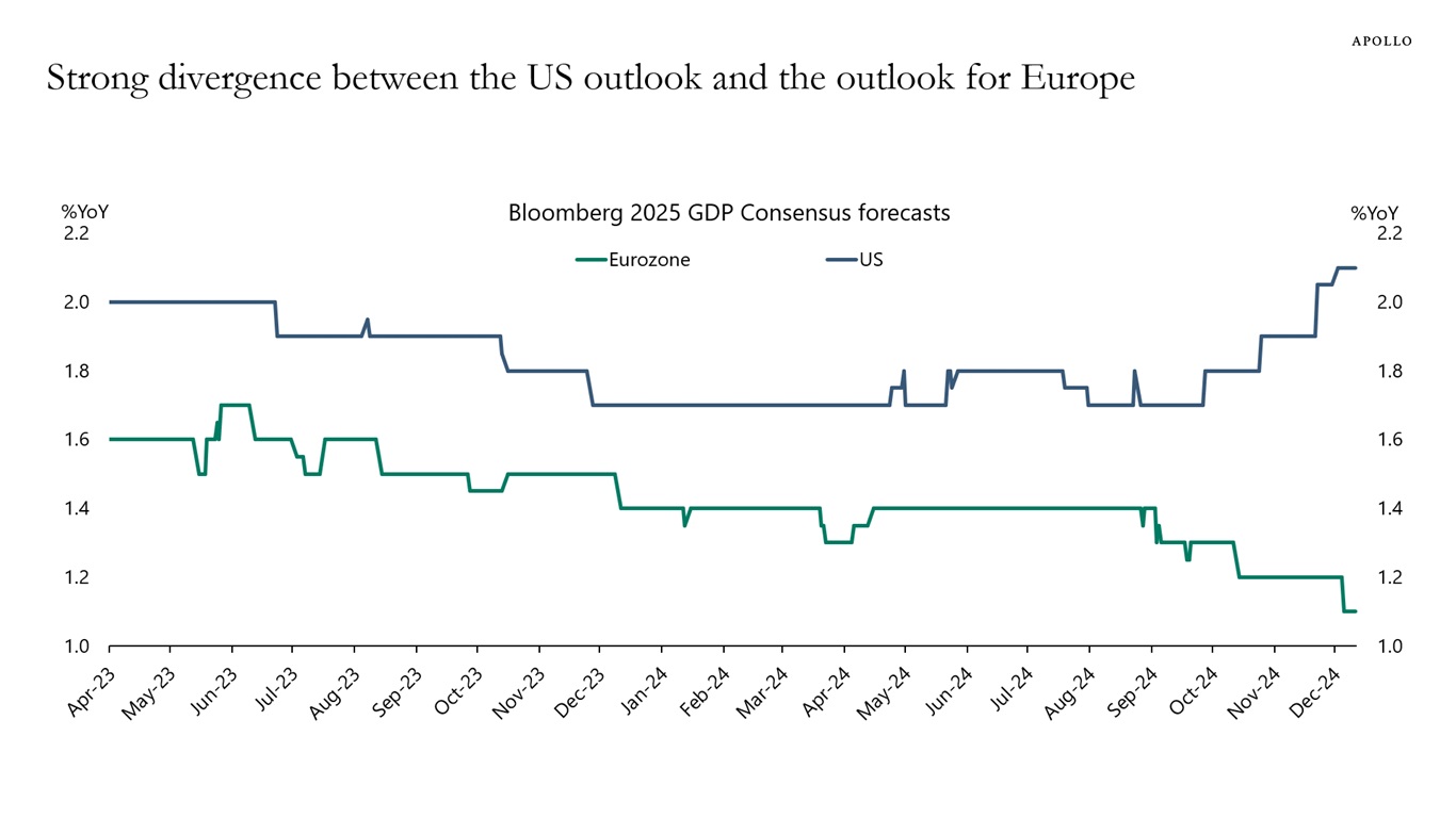 The US and European business cycles are decoupling, it is highly unusual, see chart below.