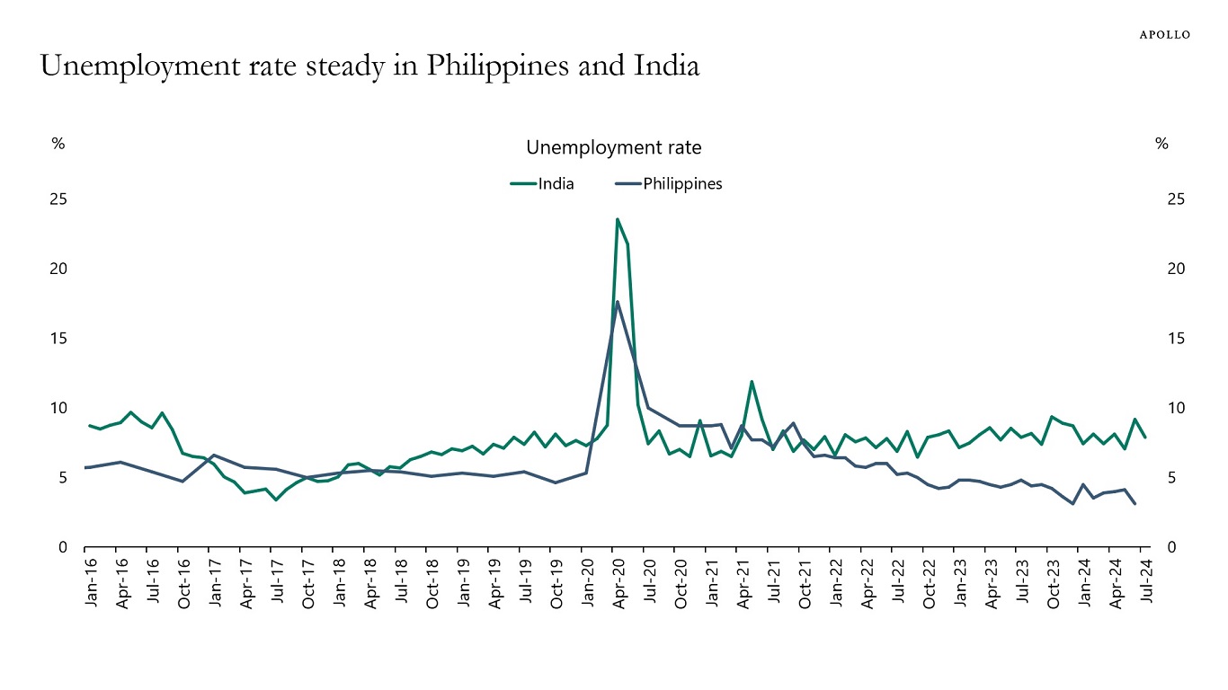 If AI is having such a profound impact on call centers, telemarketing, and other business process outsourcing jobs, then unemployment in the Philippines and India should be moving higher. But that is not what the data is showing, see chart below.