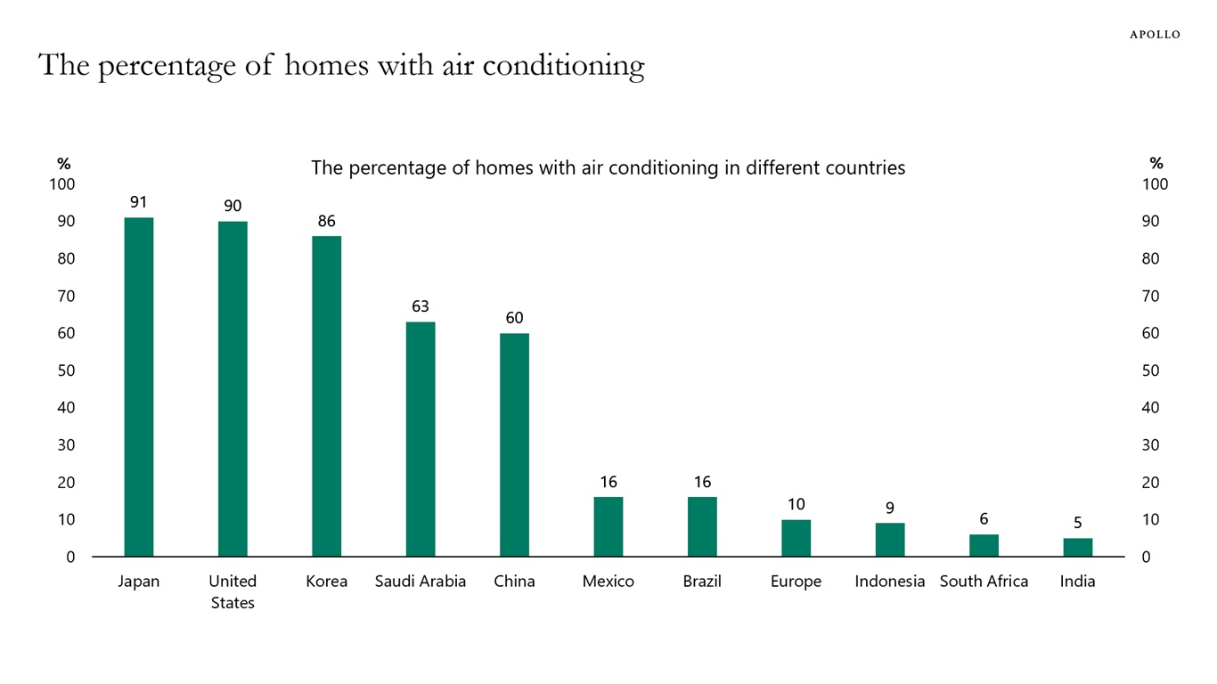 According to data from the International Energy Agency, 90% of homes in the US have air conditioning, but only 10% of homes in Europe and 5% of homes in India, see chart below. For China, the number is 60%.