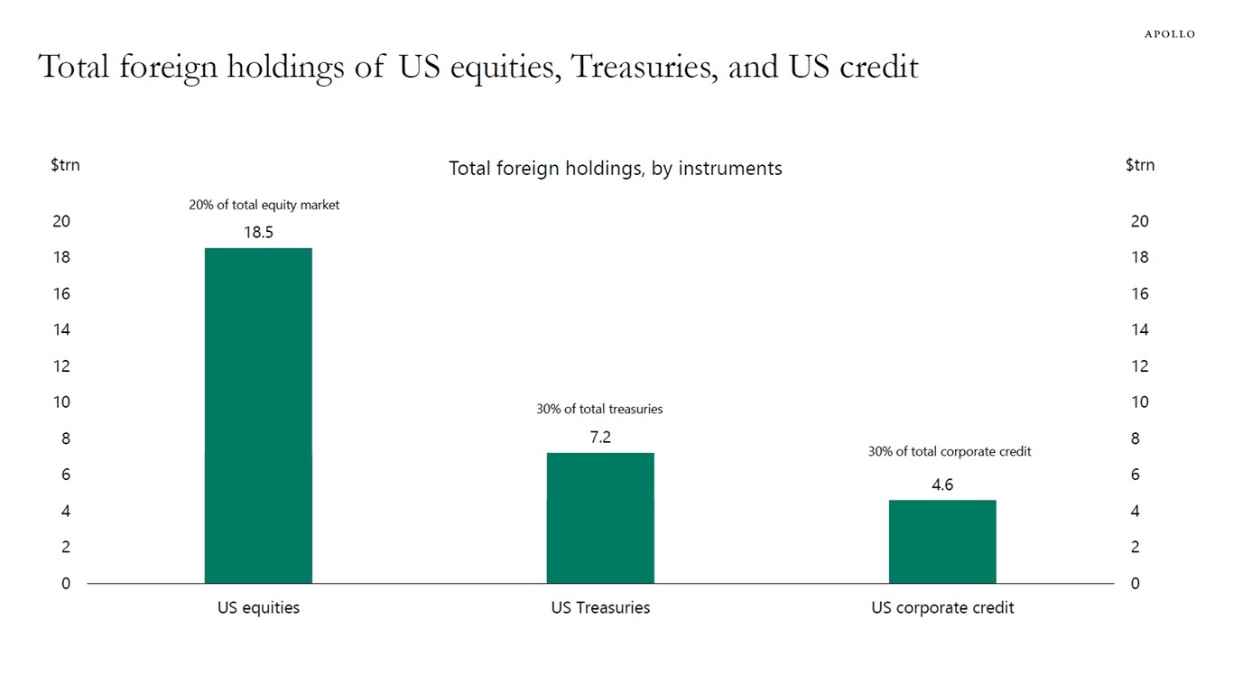 Foreigners own $19 trillion in US equities, $7 trillion in Treasuries, and $5 trillion in US credit, see chart below.