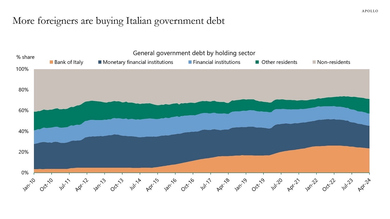 The share of Italian government bonds held by non-residents has increased over the past year, see chart below.