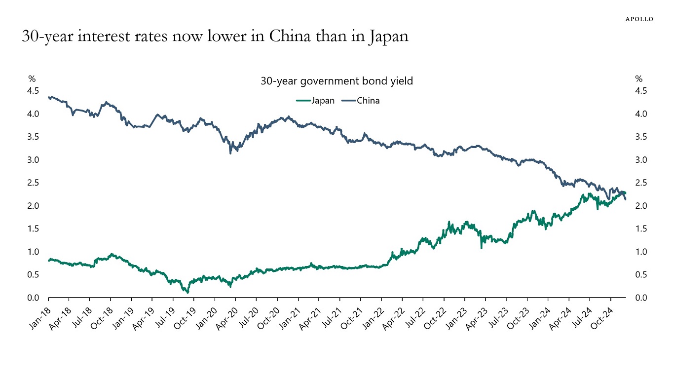 Growth and inflation are rising in Japan and falling in China. As a result, 30-year government bond yields are now lower in China than in Japan, see chart below.