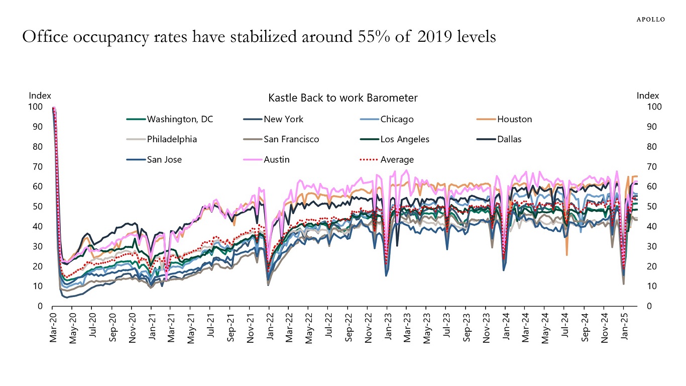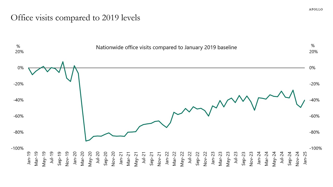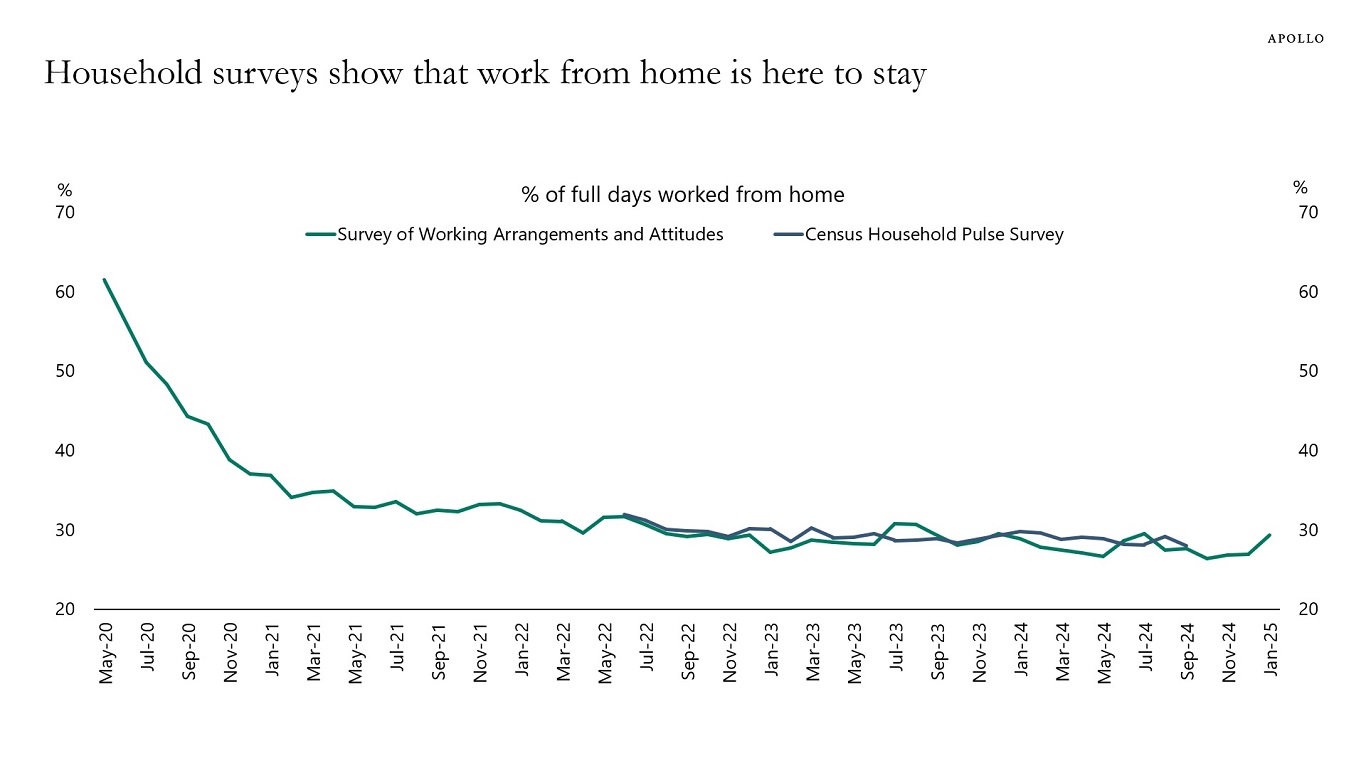 Household surveys, entry swipes, and location data show that work from home has become a new permanent feature of the labor market, with all indicators moving sideways since 2023, see charts below.