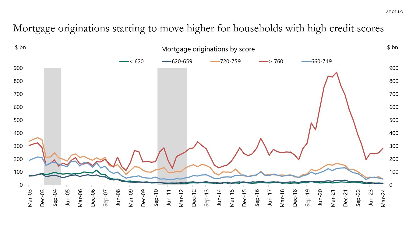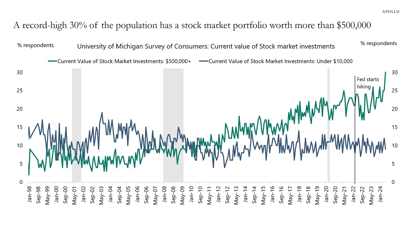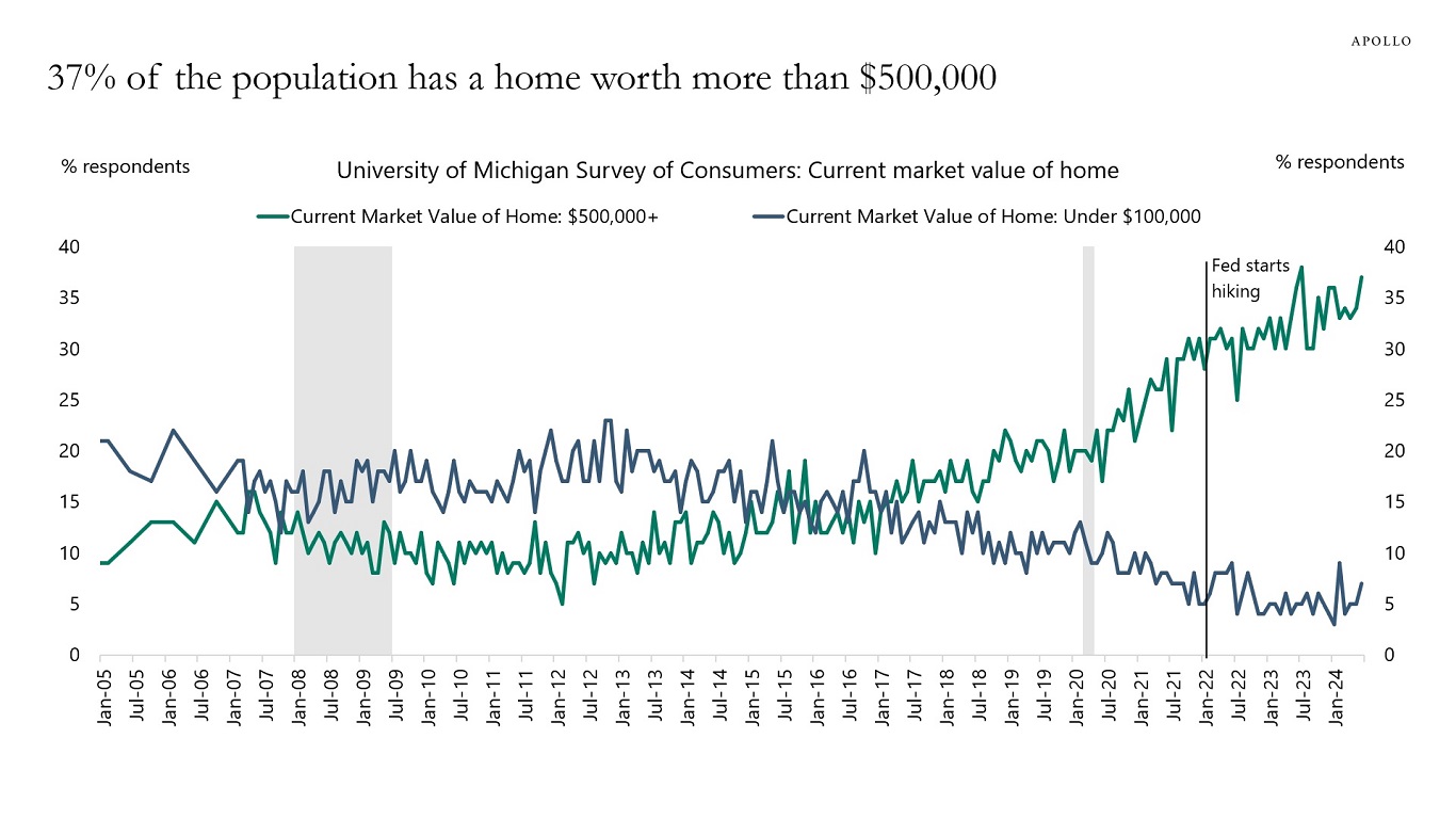 The University of Michigan investigated the source and found that one reason was that they had switched their survey methodology from phone interviews to web interviews. Survey respondents are more willing to express high inflation expectations during web interviews than during phone interviews. The problem with this argument is that you would think that the same bias would also be present for households with lower inflation expectations. Despite this methodological difference, the bottom line remains that half of the population has extreme long-term inflation expectations, which is a problem for the Fed and its credibility.
