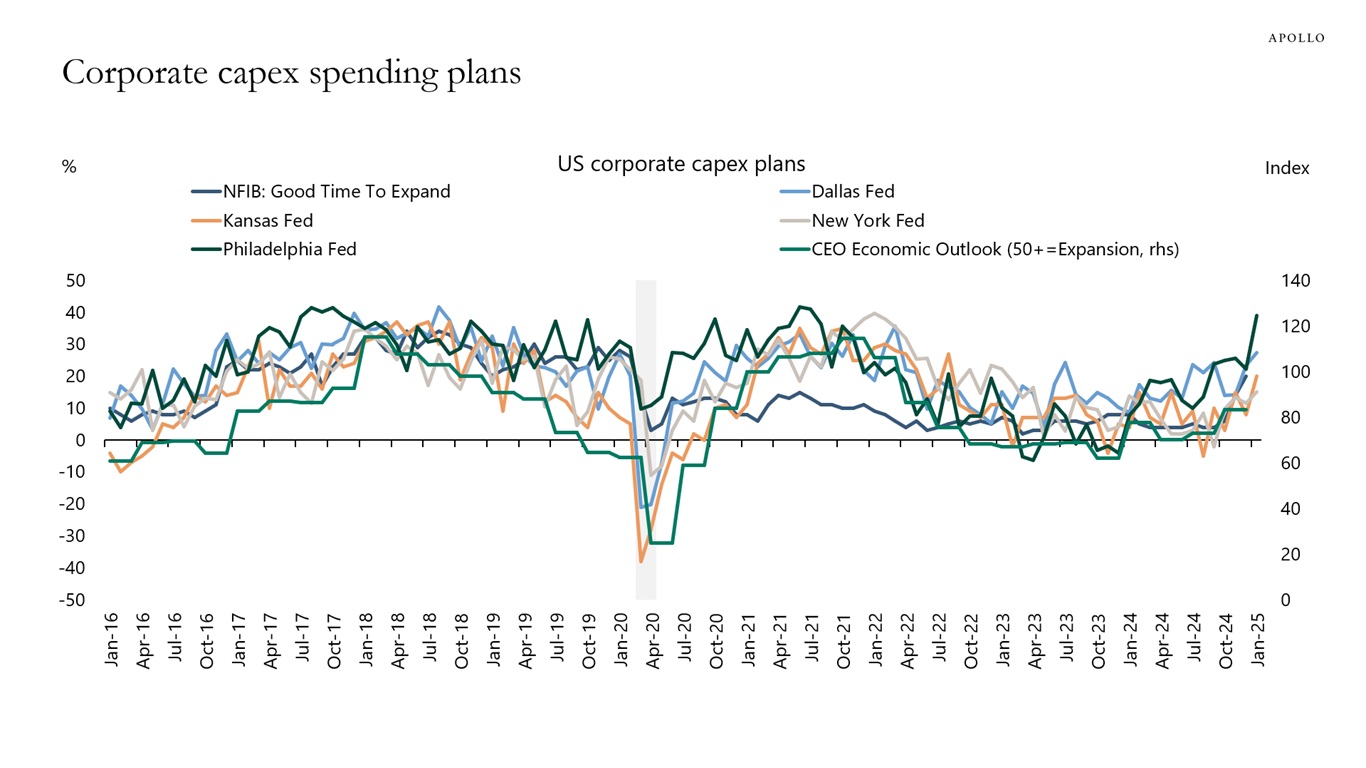 Source: Business Roundtable; NFIB; Federal Reserve Bank of Philadelphia, Dallas, New York, Kansas, and Richmond; Apollo Chief Economist