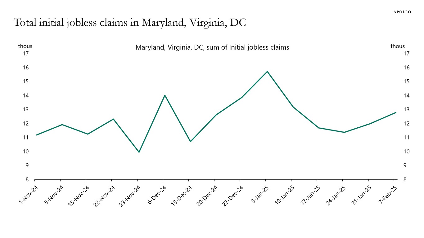 We are watching the weekly data for the number of people who file for unemployment benefits in Washington DC, Maryland, and Virginia, and any impact federal government layoffs may have on nationwide jobless claims, see chart below. This data comes out every Thursday at 8:30 a.m. ET.