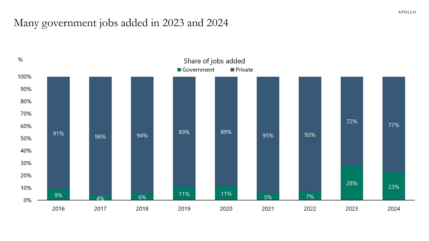 About 25% of jobs added in the US economy over the past two years were government jobs, up from 5% in 2021 and 7% in 2022, see chart below.
