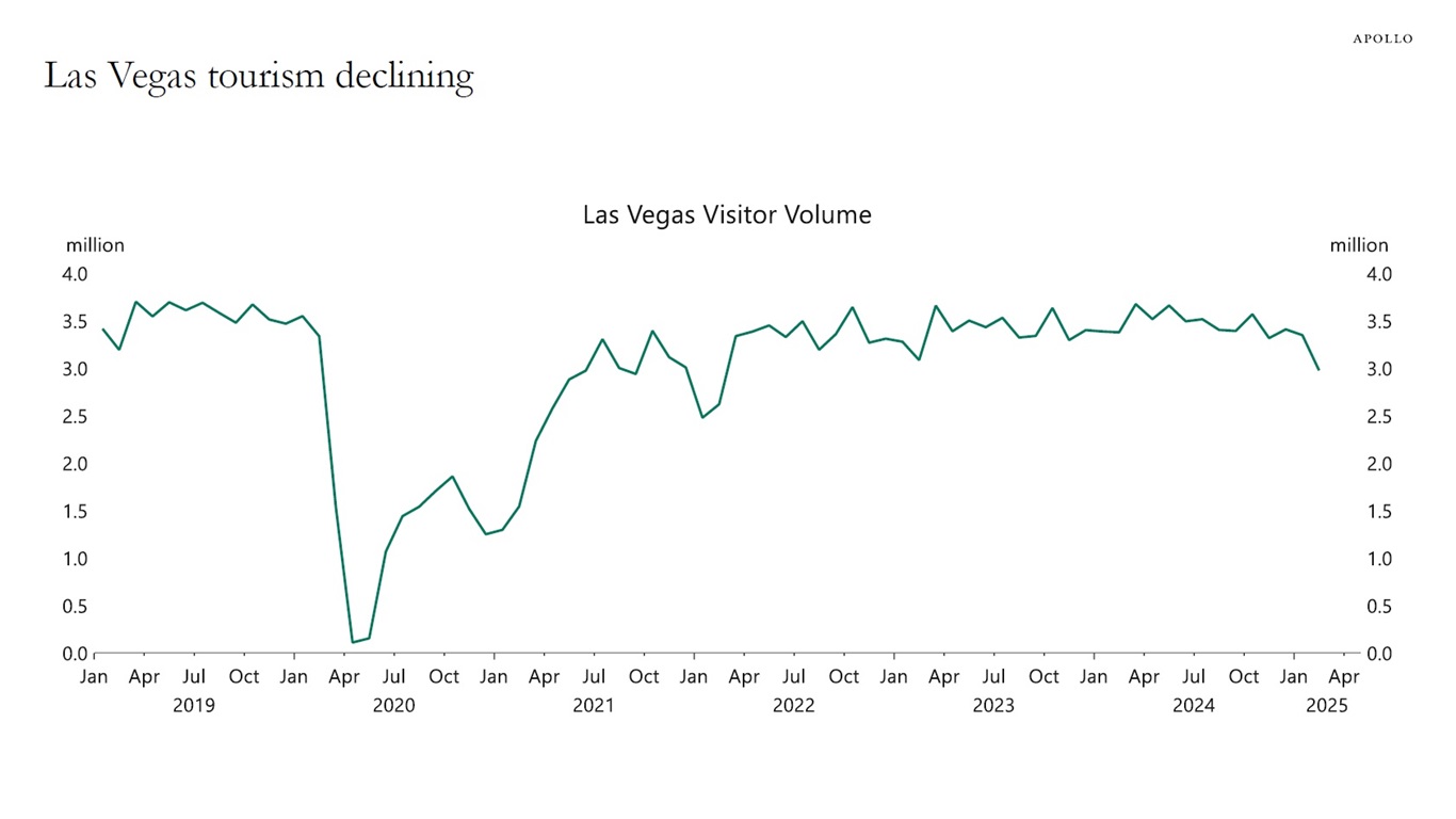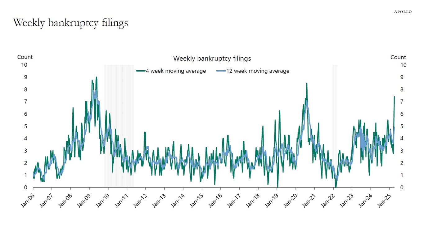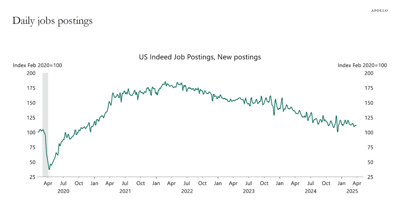 Sources: Bloomberg, Macrobond, Apollo Chief EconomistSources: Bloomberg, Macrobond, Apollo Chief EconomistNote: Filings are for companies with more than $50mn in liabilities. For week ending on April 4, 2025. Sources: Bloomberg, Apollo Chief Economist Sources: Boxofficemojo.com, Apollo Chief EconomistSources: Indeed, Bloomberg, Macrobond, Apollo Chief EconomistSources: US Department of Homeland Security, Macrobond, Apollo Chief EconomistSources: US Department of Labor, Macrobond, Apollo Chief Economist
