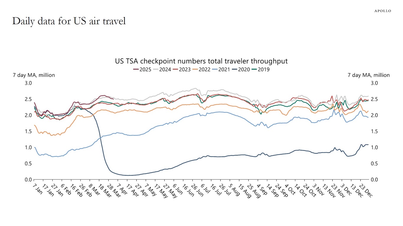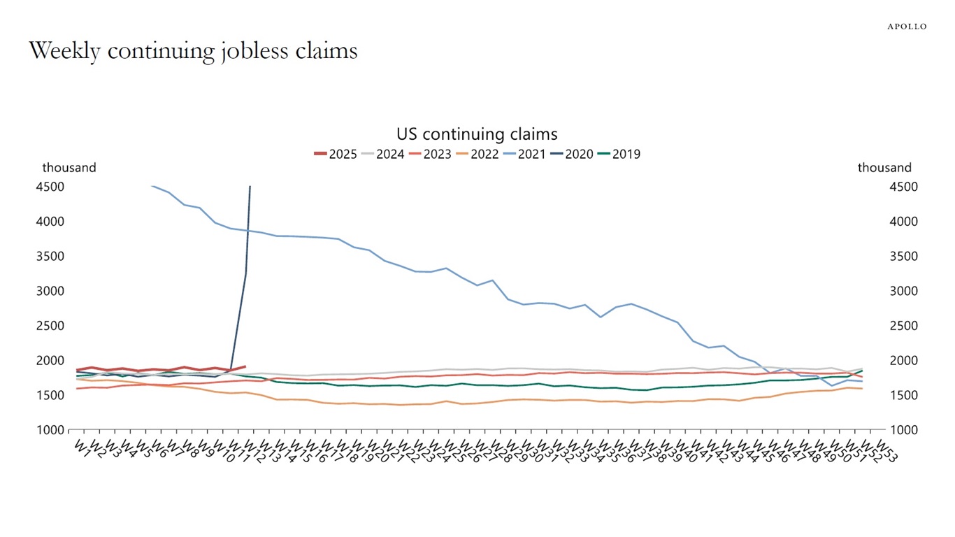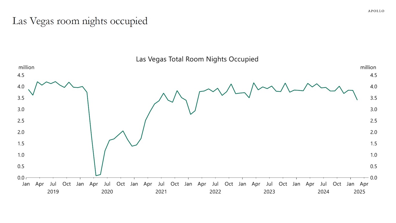 Sources: Bloomberg, Macrobond, Apollo Chief EconomistSources: Bloomberg, Macrobond, Apollo Chief EconomistNote: Filings are for companies with more than $50mn in liabilities. For week ending on April 4, 2025. Sources: Bloomberg, Apollo Chief Economist Sources: Boxofficemojo.com, Apollo Chief EconomistSources: Indeed, Bloomberg, Macrobond, Apollo Chief EconomistSources: US Department of Homeland Security, Macrobond, Apollo Chief EconomistSources: US Department of Labor, Macrobond, Apollo Chief Economist