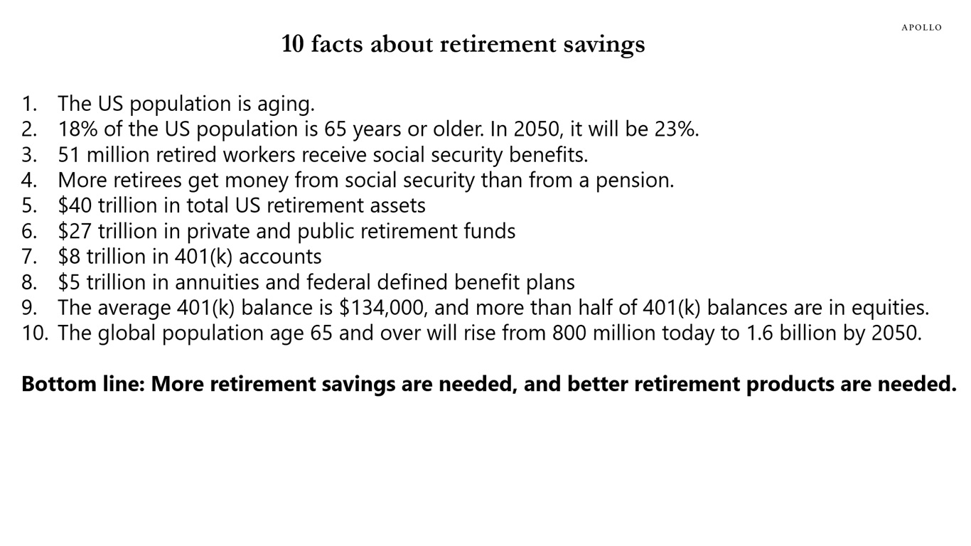 The population is aging, there is not enough retirement savings, and retirement asset allocation is distorted with too much money in daily liquid equities highly concentrated in the Magnificent Seven. The bottom line is that more retirement savings are needed and better retirement products are needed. Our chart book, available here, looks at the growing retirement savings challenge.