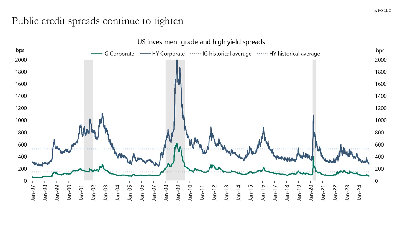 Spreads for public investment grade credit have tightened to just 74 basis points on the index, see the first chart.
