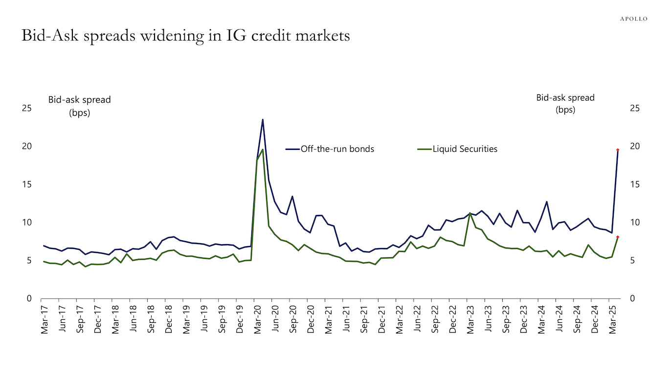 The chart shows that bid-ask spreads have spiked post the April 2 tariff announcement.