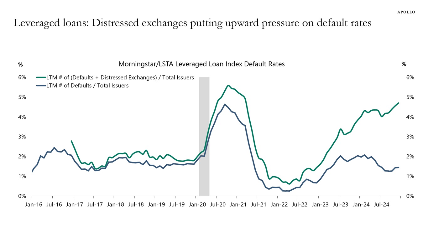 The implication is that even as default rates have ticked up, credit losses suffered by high-yield and leveraged-loan investors remain pretty muted. However, with interest rates staying higher for longer, the increase in distressed exchanges could pressure future recoveries if the underlying issuer fundamentals remain stressed.
