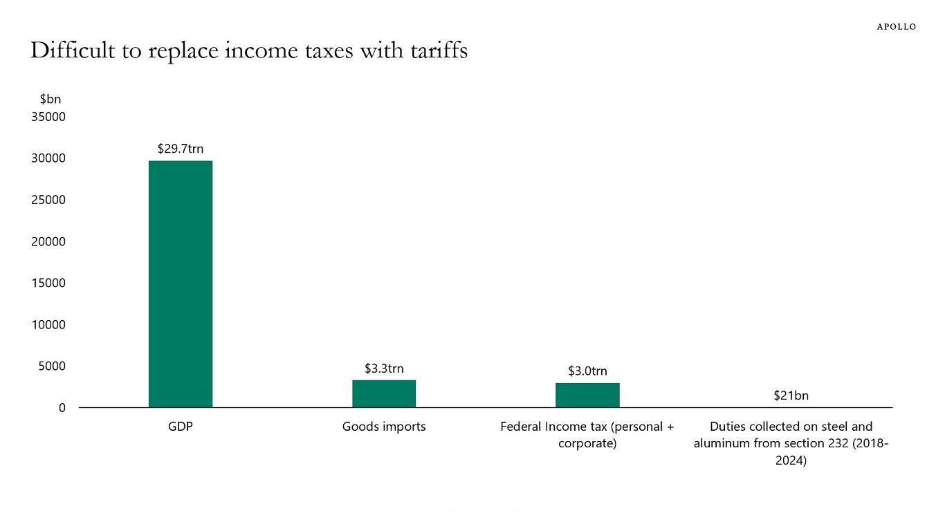 Note: Data for 2024 for GDP, goods imports, and income tax. Source: BEA, OMB, Haver Analytics, US Customs and Borders Protection, Apollo Chief Economist