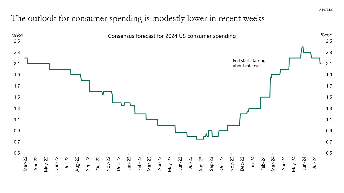 The consensus has in recent weeks lowered the outlook for consumer spending modestly, see chart below.