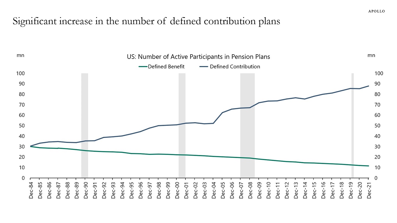There are 10 million participants in defined benefit plans and 90 million in defined contribution plans such as the 401(k), see chart below.