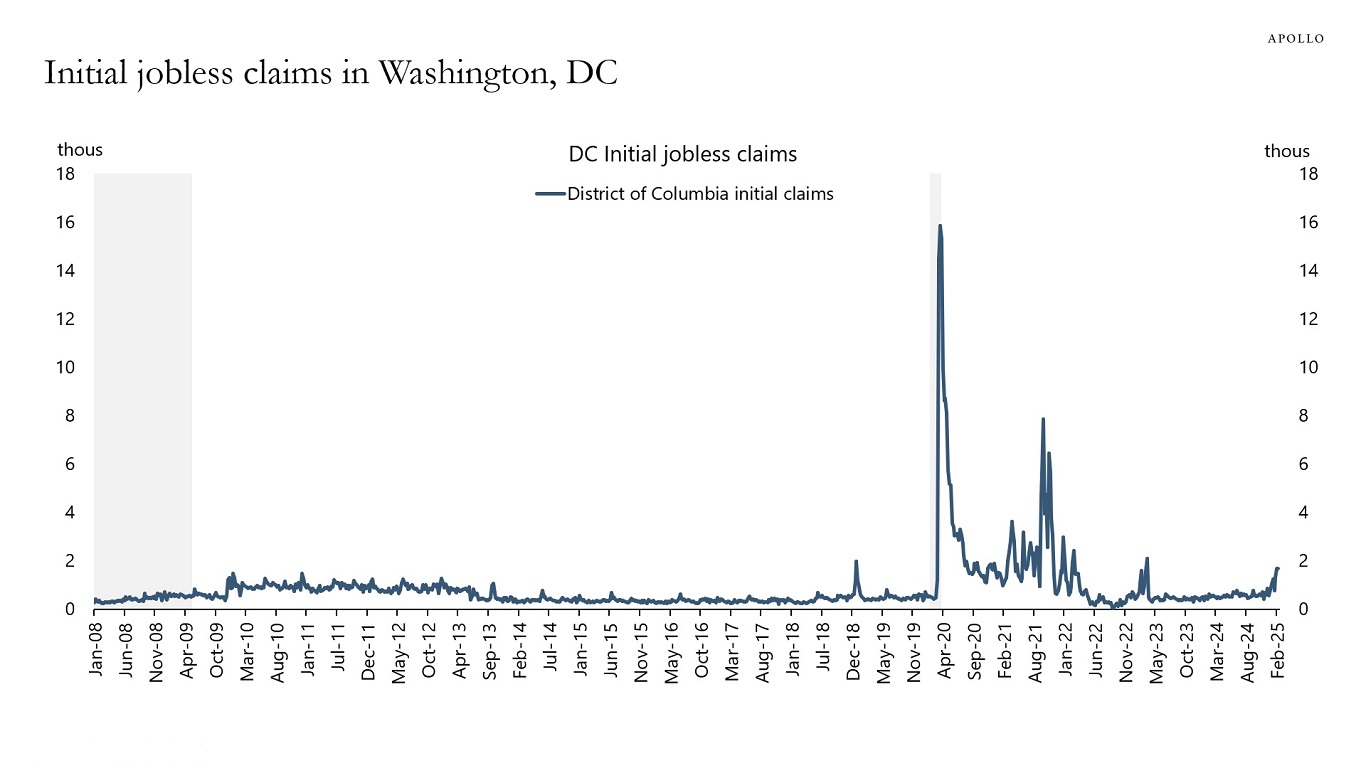 1) The consensus expects total DOGE-related job cuts to be 300,000, and the number of people filing for unemployment benefits has been rising in Washington, DC, but not in Virginia, Maryland, and Washington, DC combined, see the first two charts. Total employment in the United States is 160 million, with 7 million unemployed. Also, about 5 million people change jobs every month. In that context, 300,000 federal jobs lost is not much. However, studies show that for every federal employee, there are two contractors. As a result, layoffs could potentially be closer to 1 million. Any increase in layoffs will push jobless claims higher over the coming weeks, and such a rise in the unemployment rate is likely to have consequences for rates, equities, and credit.