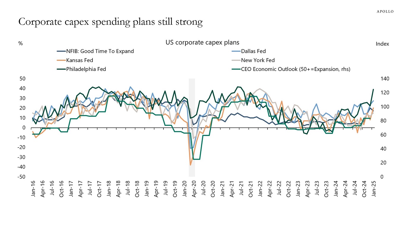 Source: Business Roundtable; NFIB; Federal Reserve Bank of Philadelphia, Dallas, New York, Kansas, and Richmond; Apollo Chief Economist