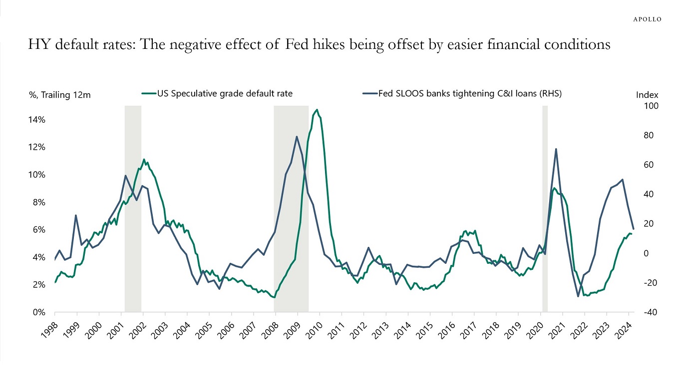Higher costs of capital have pushed up default rates in high yield corporate credit since the Fed started raising rates in March 2022.