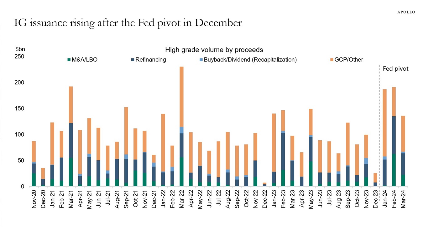 Source: Pitchbook LCD, Apollo Chief Economist. Note: GCP means general corporate purpose, which means making or financing any payment for working capital, capital expenditures, or any other general corporate purpose.Source: Pitchbook LCD, Apollo Chief Economist