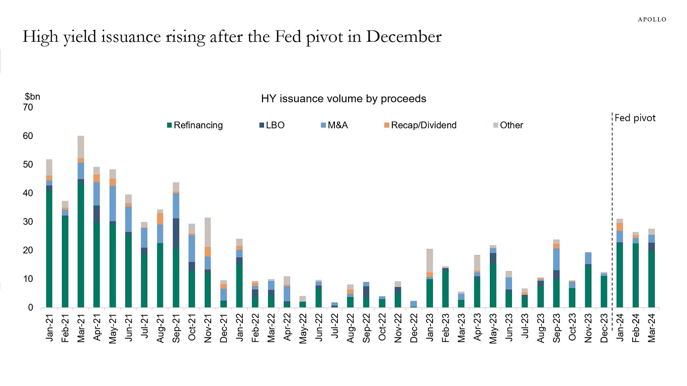 Capital market activity has increased significantly since the Fed meeting in December, with more issuance in IG and HY in January, February, and March, see charts below.