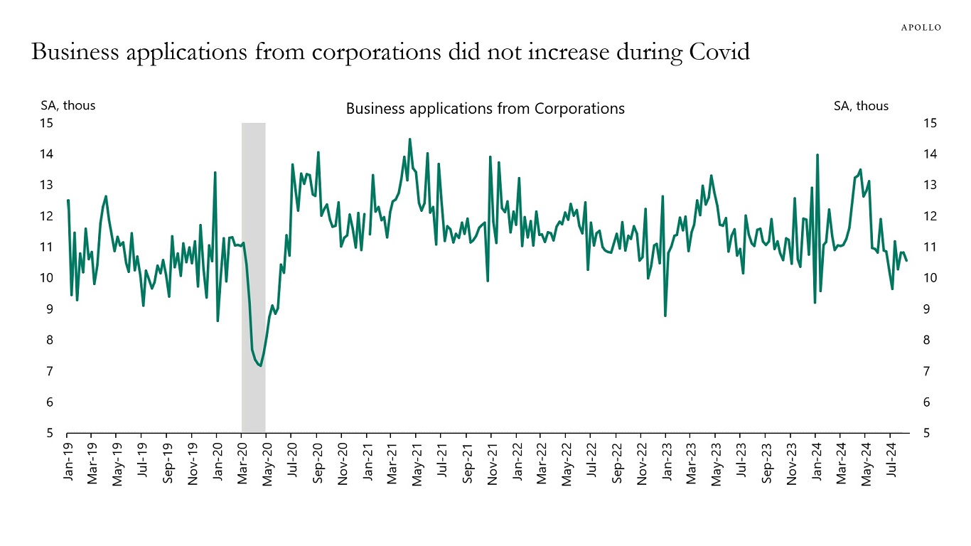 During the pandemic, many new businesses were created, see the first chart below. But the new businesses created were different. They were created by individuals rather than corporations, and they were smaller and less likely to hire a lot of people, see the second and third chart.