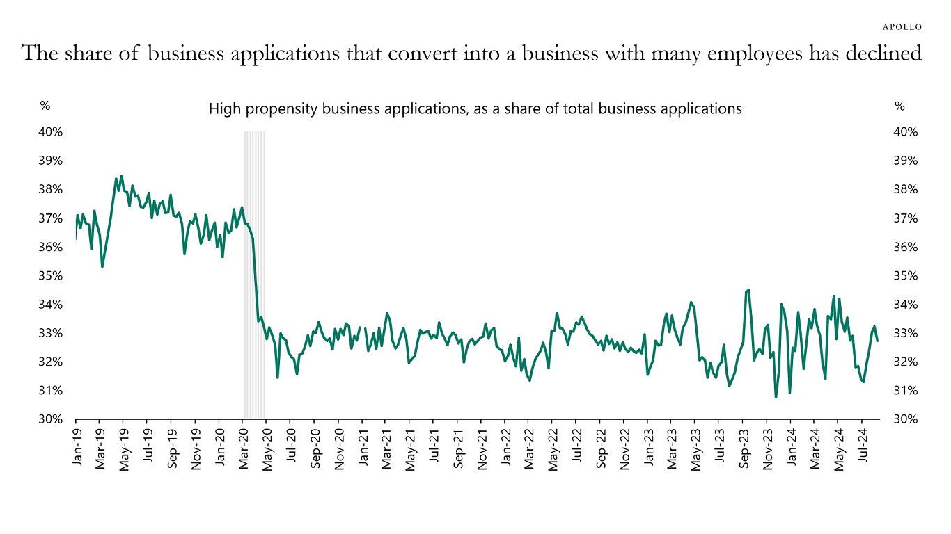 Source: Census Bureau, Haver Analytics, Apollo Chief EconomistSource: Census Bureau, Haver Analytics, Apollo Chief EconomistNote: High-propensity businesses are those that have a higher likelihood of becoming businesses with employees and payroll capabilities, and include those that: Define themselves as a corporate entity, indicate a plan to hire employees, have a date for providing first wages and planned wages, have been given a NAICS industry code that aligns with accommodation and food services, construction, manufacturing, retail, professional, scientific or technical services, educational services and healthcare. Source: Census Bureau, Haver Analytics, Apollo Chief EconomistSource: Census Bureau, Haver Analytics, Apollo Chief EconomistSource: Census Bureau, Apollo Chief Economist. Note: Data for 2022.