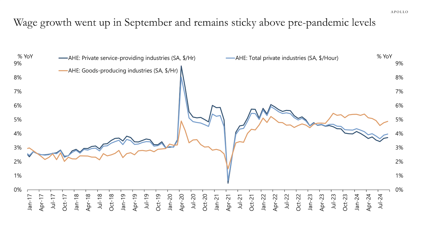 The incoming data continues to remain robust. The US economy added 254,000 jobs in September versus a consensus expectation of 150,000 jobs, the unemployment rate fell from 4.2% to 4.1%, wage growth is solid and remains sticky, job openings are going up, and the ISM services reading is also strong.