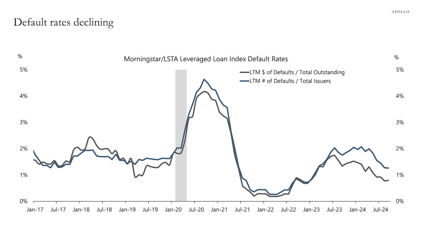 Source: BLS, Haver Analytics, Apollo Chief EconomistNote: The Worker Adjustment and Retraining Notification (WARN) Act helps ensure 60 to 90 days advance notice in cases of qualified plant closings and mass layoffs. WARN factor is the Cleveland Fed estimate for WARN notices (https://www.clevelandfed.org/publications/working-paper/wp-2003r-advance-layoff-notices-and-aggregate-job-loss). Source: Department of Labor, Haver Analytics, Federal Reserve Bank of Cleveland, Apollo Chief EconomistSource: PitchBook LCD, Apollo Chief Economist