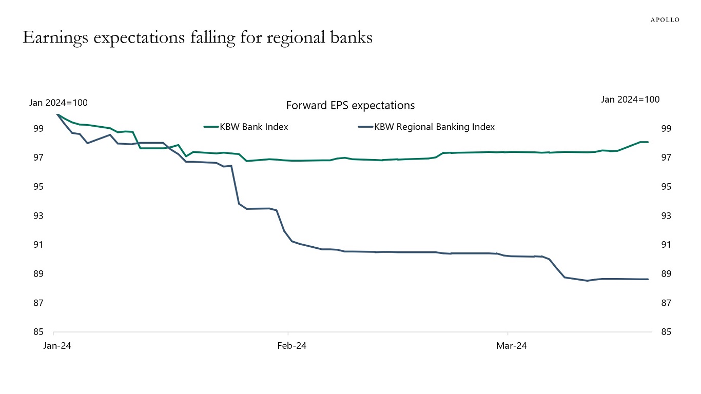 Since the beginning of the year, the banking sector has been underperforming the S&P 500, and the regional banks have been underperforming the broader banking sector, driven by deteriorating earnings expectations for regional banks, see charts below. Our latest banking sector chart book is available here.