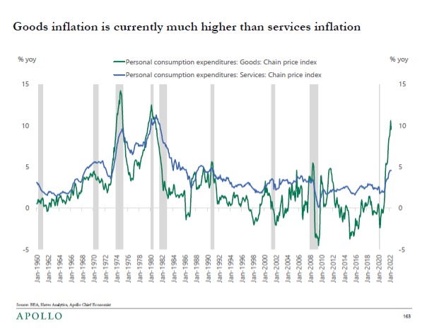 Globalization has been reversed because of COVID, Ukraine, and sanctions. As a result, goods inflation at 10% is now significantly higher than services inflation at 5%, see the first chart.