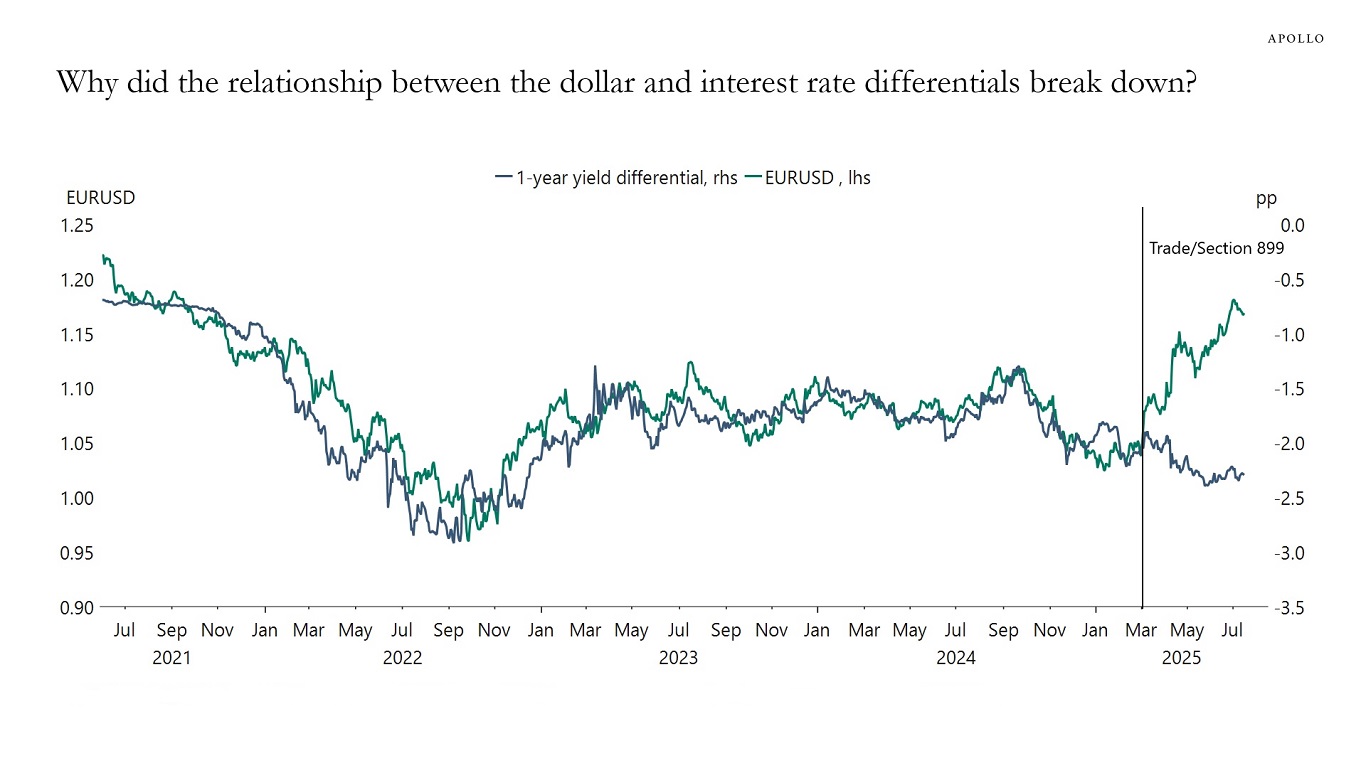 Note: 1-year yield differential = 1-year German government bill minus 1-year T-bill. pp = percentage points. Sources: Bloomberg, Macrobond, Apollo Chief EconomistSources: Bloomberg, Apollo Chief EconomistSources: US Department of Treasury, Macrobond, Apollo Chief Economist