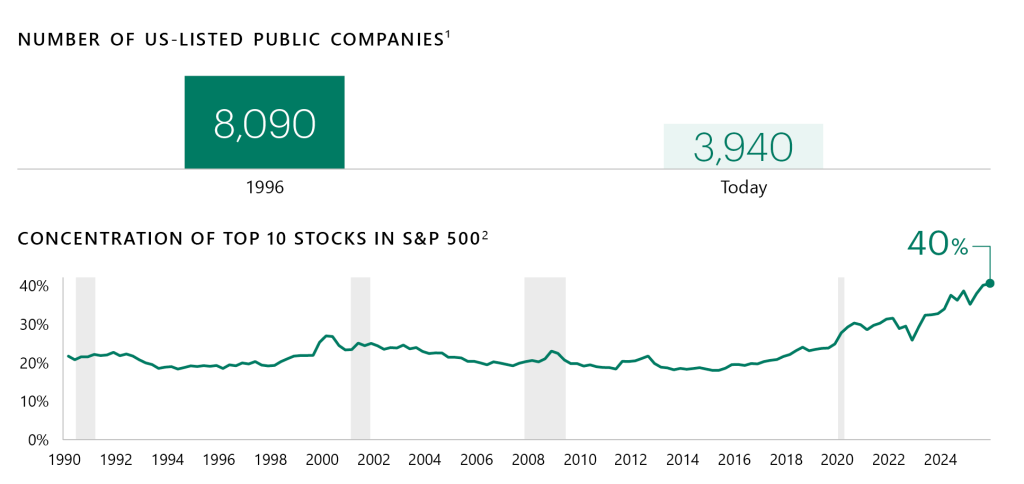 - The number of public companies has been cut in half over two decades, shrinking the investable universe.
