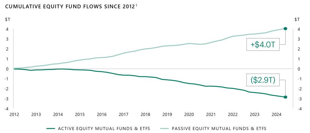 These are not cyclical quirks but long‑term secular trends away from active management and towards index investing. While indexation has benefited investors with lower costs, it has also distorted price discovery and fundamental valuation.