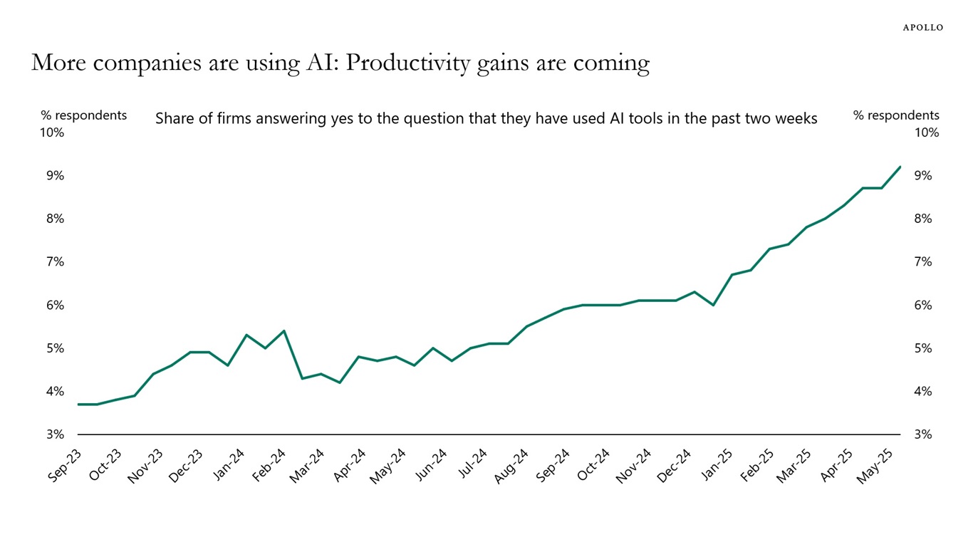Note: AI adoption rate answers the question: In the last two weeks, did this business use Artificial Intelligence (AI) in producing goods or services? Examples of AI: machine learning, natural language processing, virtual agents, voice recognition, etc. Sources: US Census Bureau Business Trends and Outlook Survey, Apollo Chief Economist