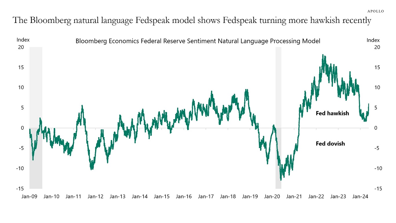 Source: Bloomberg, Apollo Chief Economist. Note: Fedspeak: NLP model of Fed sentiment. The index is underpinned by an NLP algorithm trained on Bloomberg News headlines, covering about 6,200 speaking engagements by Fed officials since 2009. A reading below zero implies rate cuts, while above zero indicates a tightening basis.