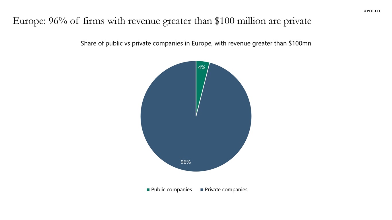 The total addressable market for European direct lending to large-cap companies is enormous. Ninety-six percent of firms in Europe with revenue greater than $100 million are private, see chart below.