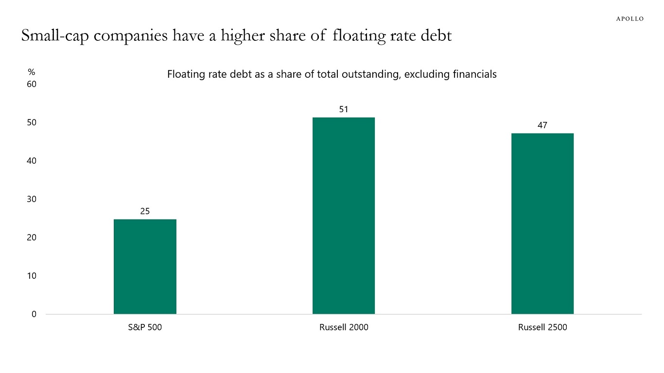 Small-cap companies have a higher share of floating rate debt, see the first chart. Specifically, floating rate debt as a share of total outstanding debt for the Russell 2000 is 51%. For the S&P 500, the share is 25%.
