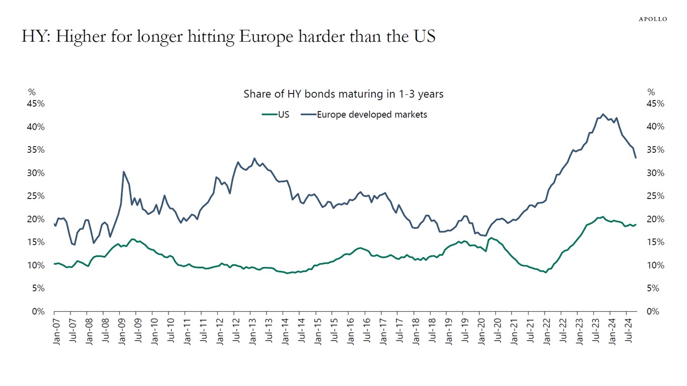 For high yield, more companies in Europe need to refinance over the coming years compared with the US, see chart below.