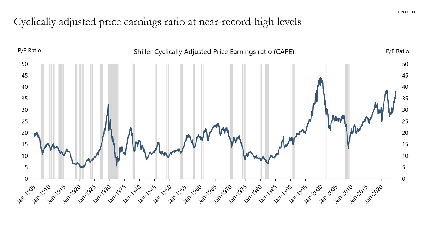 Specifically, the cyclically adjusted price earnings ratio at 38 is near all-time highs, significantly above its long-term average at 17, see chart below.