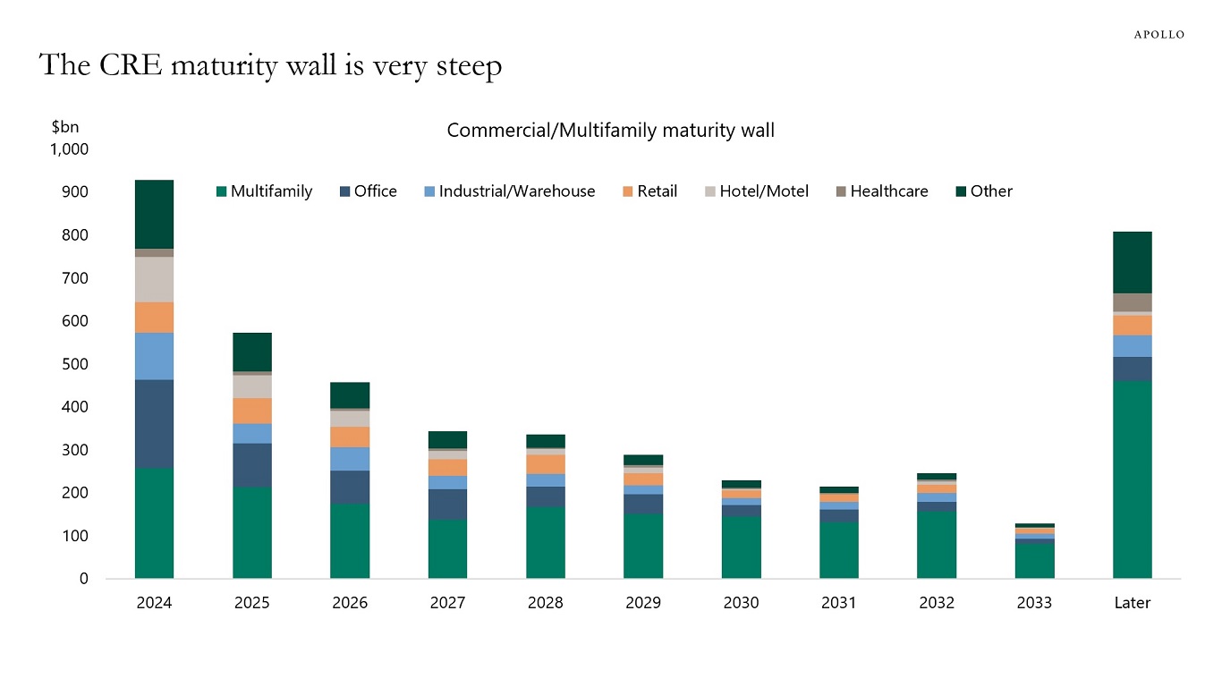 Combined with the steep maturity wall for CRE, see the second chart, the bottom line is that the pain in office, apartments, and industrial real estate continues.