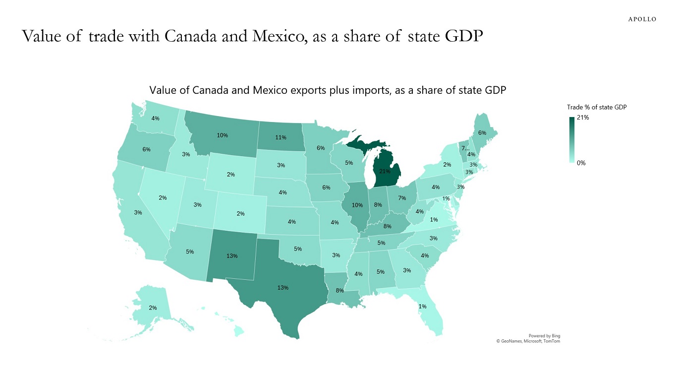 Note: Data for 2024. Source: International Trade Administration, BEA, Apollo Chief Economist