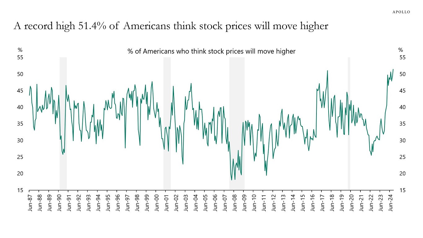 The Conference Board asks US households about their outlook for the stock market, and a record high of 51.4% say that stock prices will move higher, see chart below.