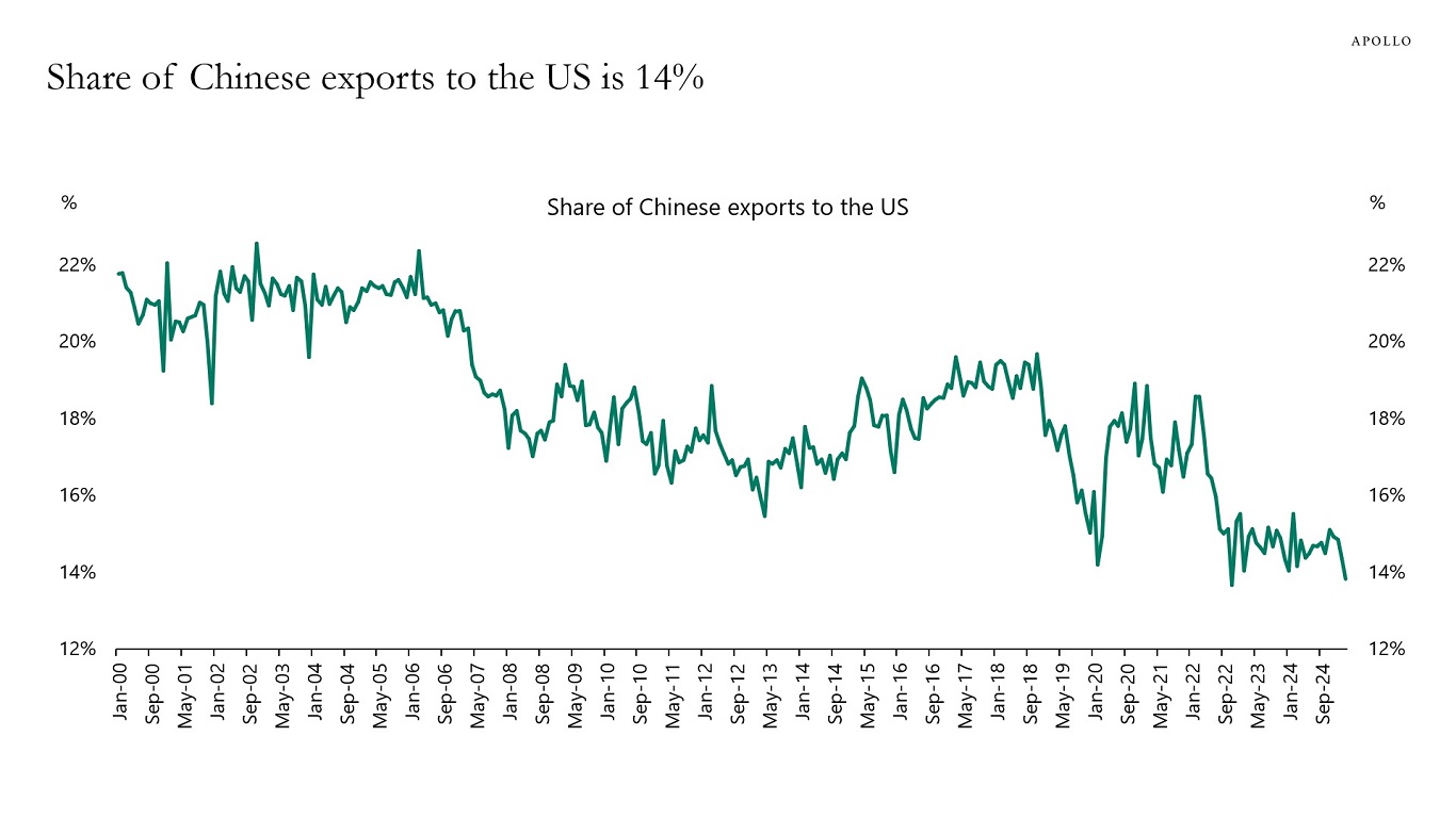 The share of Chinese exports going to the US has declined from 20% to 14% since 2017, see chart below.