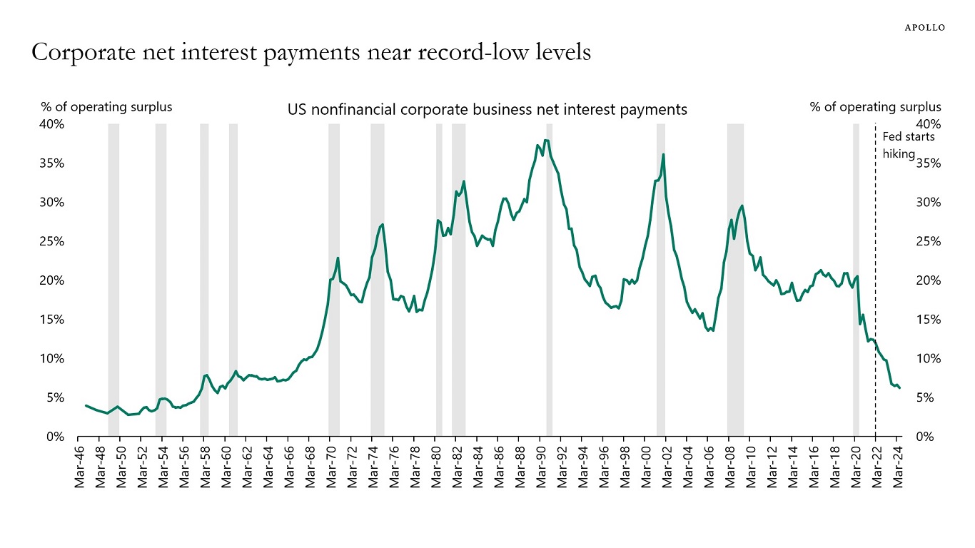 But because of locked-in low interest rates combined with strong corporate earnings, net interest payments as a share of operating surplus have been going down.