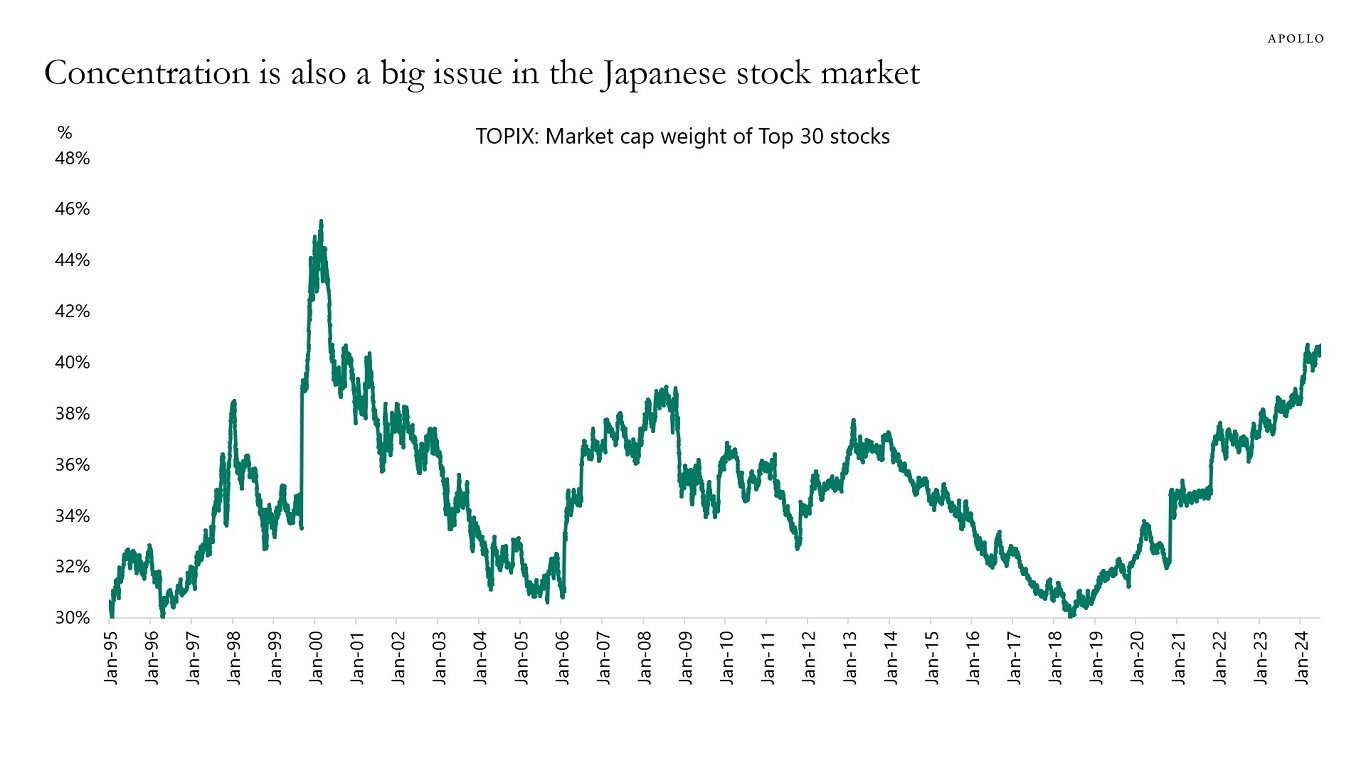 4) Concentration is also a major challenge for the Japanese stock market, with the 30 biggest stocks in the TOPIX now making up 40% of the index, see the fourth chart.